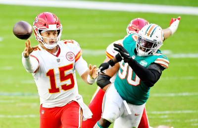 The Kansas Chiefs on Sunday coughed up an uncharacteristic four turnovers, but still beat the Miami Dolphins 33-27 to clinch their fifth straight American Football Conference West Division title. Quarterback Patrick Mahomes received a rude welcome on his first appearance at Miami’s Hard Rock Stadium since he earned Most Valuable Player honors in a Super Bowl win over the San Francisco 49ers in February. He was intercepted twice and sacked for an NFL-record 30-yard loss in the first quarter as Miami seized an early 10-0 lead, but the Chiefs scored 30 straight points to seize control and fended off the Dolphins’ fourth-quarter rally to improve to 12-1. Miami’s defeat gave the Chiefs’ main competition for the conference’s top overall seed, Pittsburgh, a boost, securing the Steelers’ first post-season berth since 2017. However, the Steelers dropped a game behind the Chiefs when they suffered just their second defeat of their season in the late game, losing 26-15 to the Buffalo Bills. Mahomes’ three interceptions marked his first multi-interception game in more than two years, but he threw for 393 yards and two touchdowns. “We won the Super Bowl here and just clinched the AFC West — it seems every time we leave this stadium we have a chat about something we accomplished,” Mahomes said. “The [bad] part, it seems, is like I have half my interceptions at this stadium.” Tyreek Hill scored on a 32-yard run and a 44-yard reception, while Travis Kelce had eight catches for 136 yards and a touchdown. Mecole Hardman returned a punt 67 yards for a touchdown and Chiefs defender Chris Jones sacked Dolphins rookie quarterback Tua Tagovailoa for a safety. Tagovailoa passed for 316 yards and two touchdowns to Mike Gesicki, cutting the deficit to six points with less than five minutes to play before Harrison Butker kicked a 46-yard field goal for the
